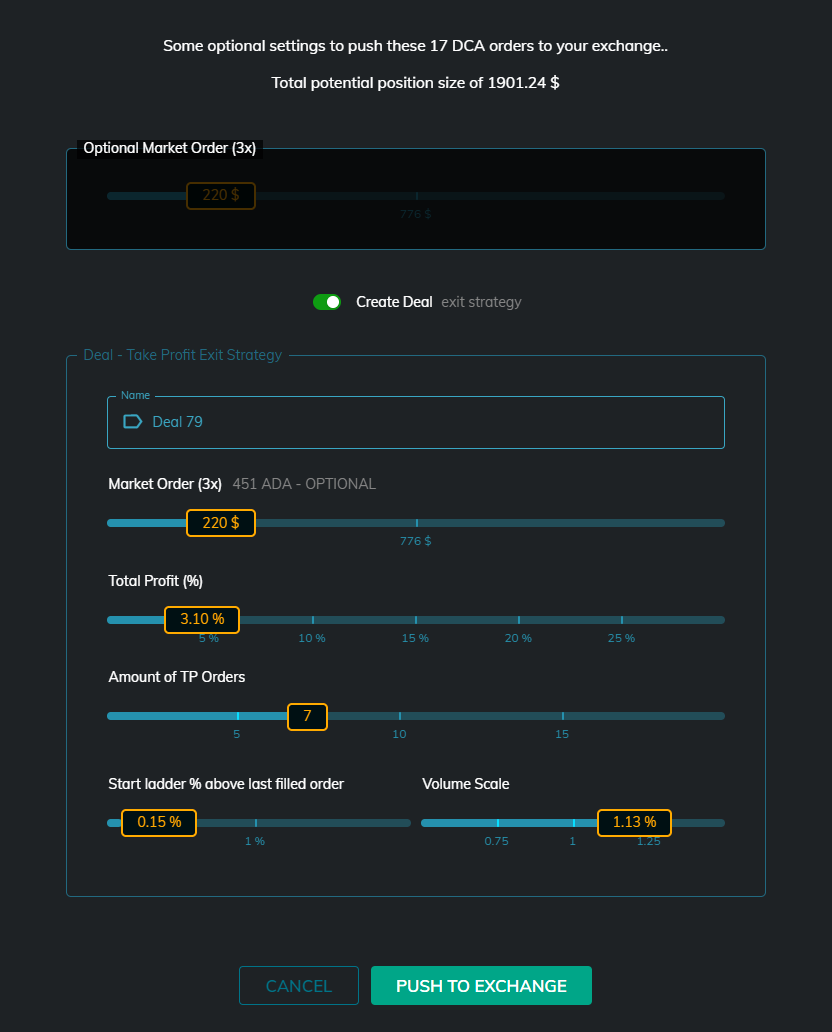 When you are ready, you can directly push your orders to your exchange with 1 click or save it and use it in a bot